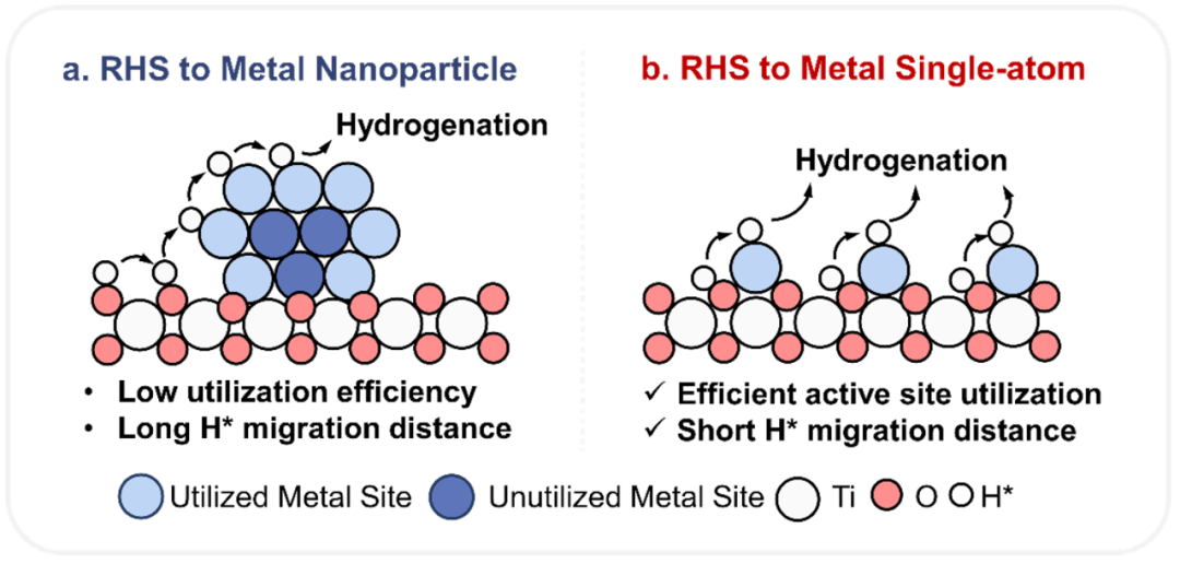 反向氢溢流(RHS)作为电化学加氢反应中的关键步骤,在能源存储、化学合成及环境修复等领域展现出变革性的潜力。传统的RHS电催化剂通常由具备优异水解离能力的可还原金属氧化物载体(如 TiO2、WO3)和发生催化反应的金属纳米颗粒活性中心组成。其通过在低过电位下产生还原性原子氢物种(H*),并定向传递至催化活性中心以完成目标反应过程(图1a)。
