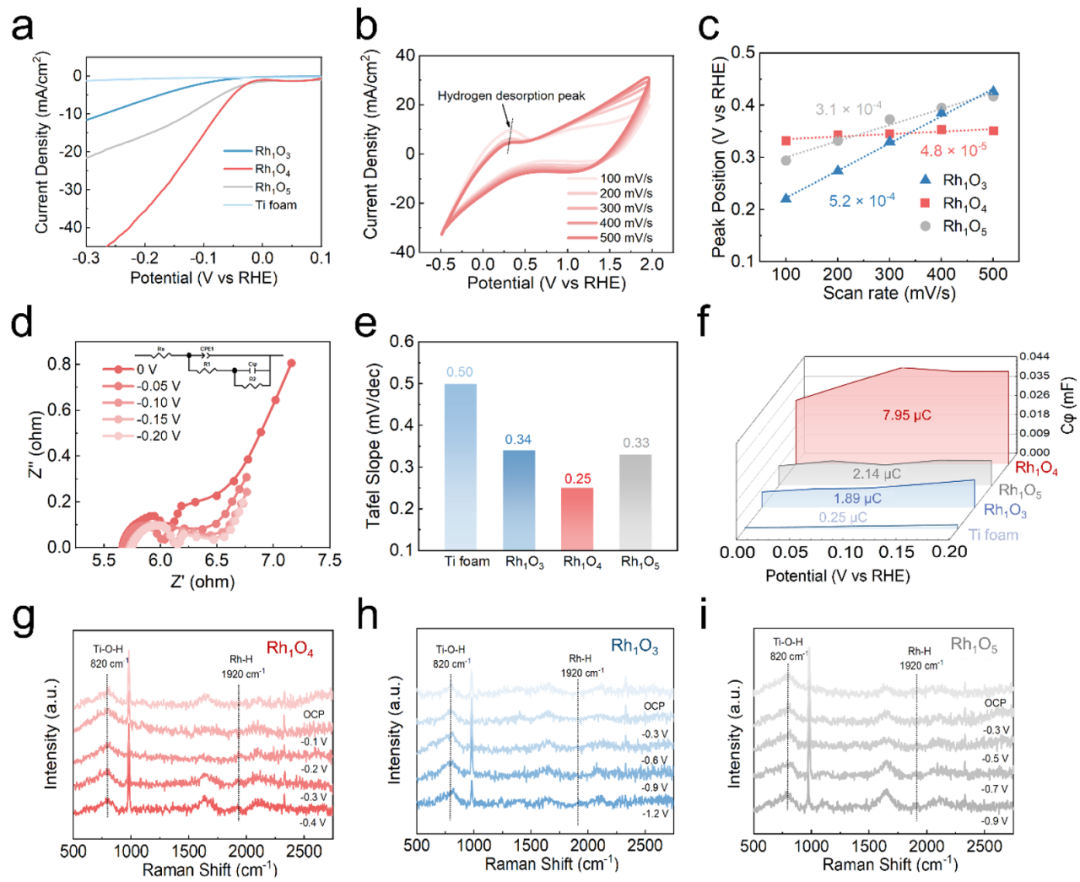 进一步利用原位电化学表征研究钛基Rh单原子电极上的反向氢溢流过程。氢脱附循环伏安结果显示,Rh1O4上的H*脱附速率较Rh1O3和Rh1O5显著加快,证明氧化钛基底上H*可以通过转移到Rh单原子位点,实现高效的脱附过程。氢吸附电化学阻抗谱结果显示,Rh1O4的氢吸附量、氢吸附速率较Rh1O3和Rh1O5均有显著上升,进一步证明Rh1O4是最优的RHS电催化剂。原位拉曼光谱结果证实,Rh1O4可在最低的过电位下激活 Rh-H键(1920 cm-1),因而能够在最温和的反应条件下触发反向氢溢流现象。