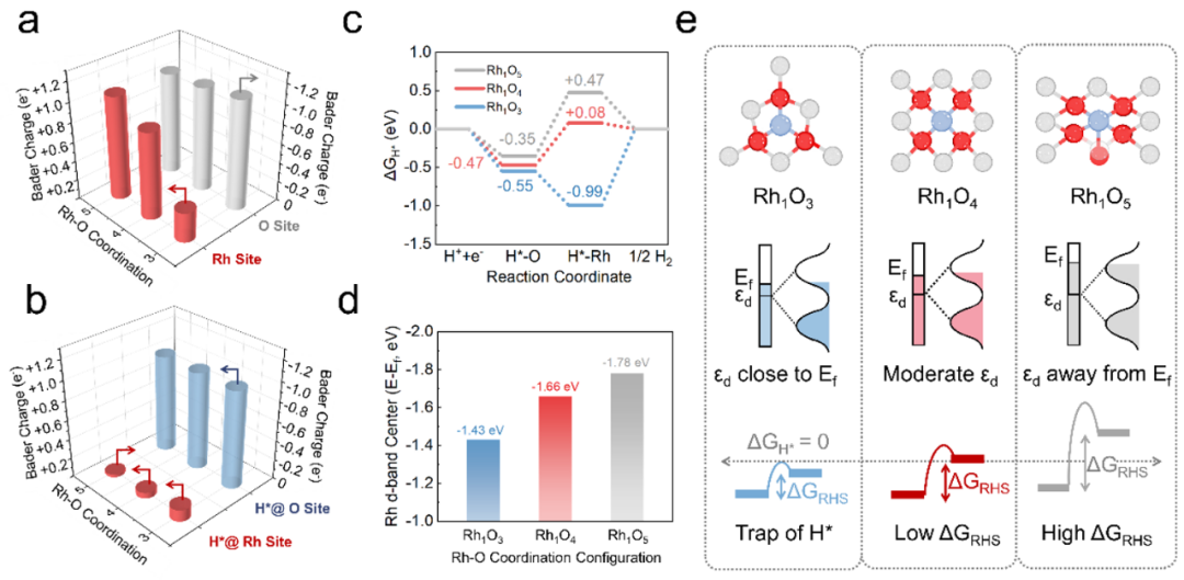 态密度分析显示,随着Rh-O配位数的上升,Rh的d带中心从–1.43 eV(Rh1O3)逐渐下移至–1.66 eV(Rh1O4)和–1.78 eV(Rh1O5),表明Rh上H*吸附逐级减弱。上述分析表明,Rh-O配位数上升会导致 Rh d 轨道电子密度下降,进而削弱其与H*的相互作用。Rh1O4独特的电子结构、配位构型使得H*可以高效地从相邻O向Rh迁移,并最终脱附、参与还原反应。