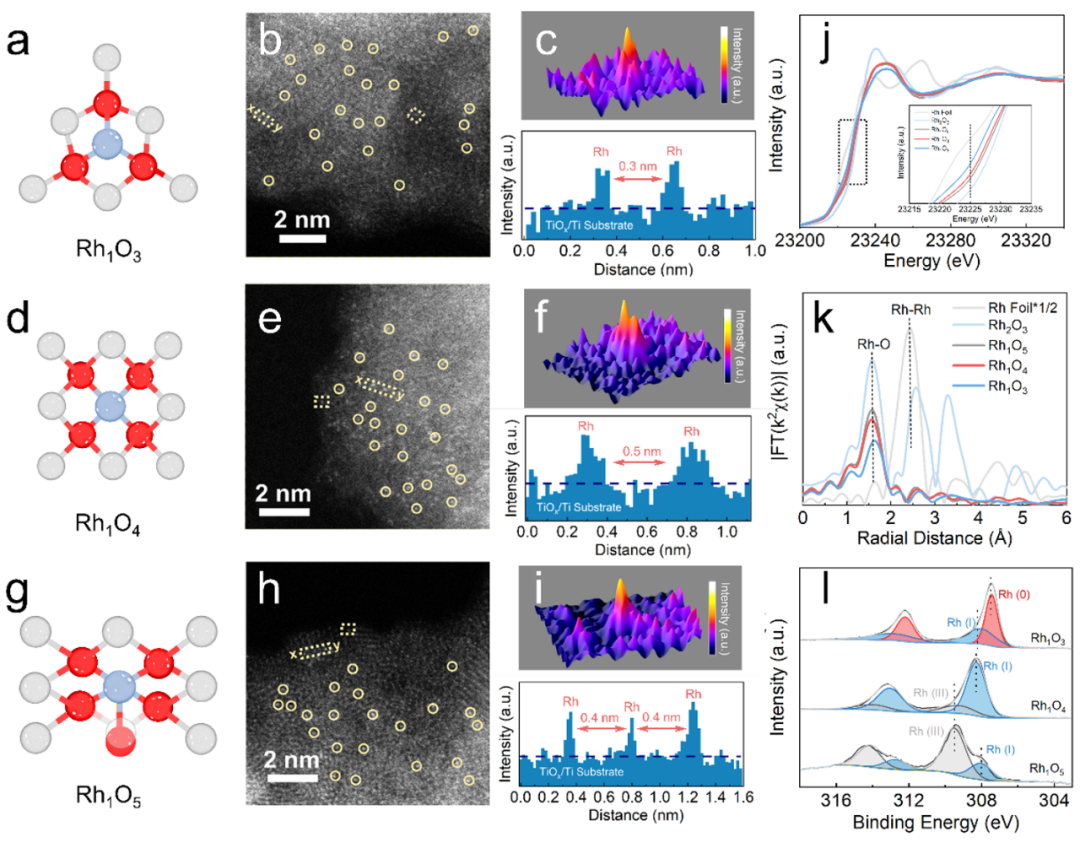 本工作在前期单原子反向氢溢流的研究基础上(Angew. Chem. Int. Ed. 2024, 63, e202401386),通过调控煅烧温度和气氛,制备出具有不同Rh-O配位环境的钛基Rh单原子电极材料(Rh1Ox,x = 3、4、5)。