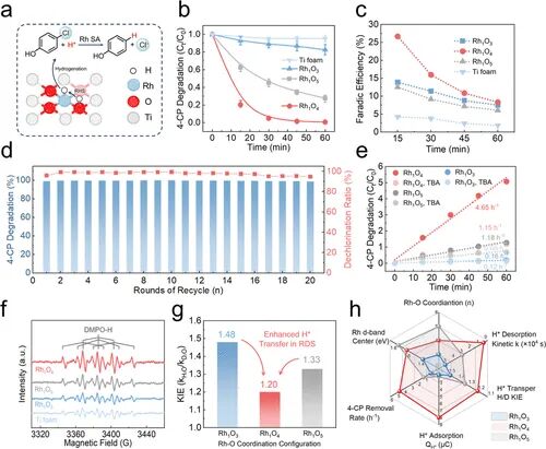 Figure 5. 4-CP degradation performance and mechanism investigation. (a) Schematic illustration of H* generation, transfer, and 4-CP hydrogenation process. (b) 4-CP degradation on Rh1O3, Rh1O4, Rh1O5, and Ti foam. (c) Faradaic efficiency of 4-CP hydrogenation on Rh1O3, Rh1O4, and Rh1O5. (d) Stability experiment for 4-CP hydrogenation on Rh1O4 in 20 rounds of electrolysis. (e) 4-CP degradation on Rh1O3, Rh1O4, and Rh1O5 with 0.1 mol/L of TBA. (f) EPR spectra. (g) KIE plot of 4-CP degradation rate constant ratio (KIE = kH2O/kD2O). h. Schematic illustration of Rh–O coordination-derived differences in single-atom RHS capacity and 4-CP hydrogenation activity.