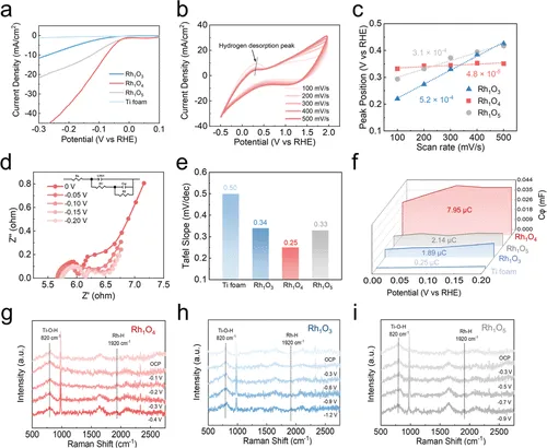 LSV显示Rh₁O₄起始电位最正(–0.07 V vs RHE)