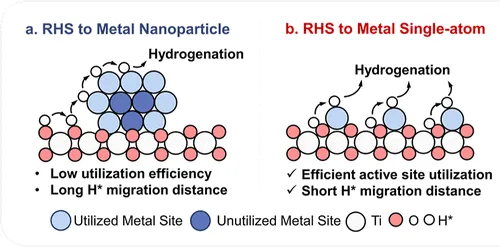 示意图比较纳米颗粒与单原子催化剂中H*迁移路径,突出单原子RHS的原子级距离优势