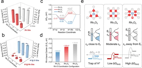 通过DFT计算揭示Rh–O配位数对d带中心、Bader电荷和H*吸附能的调控规律。