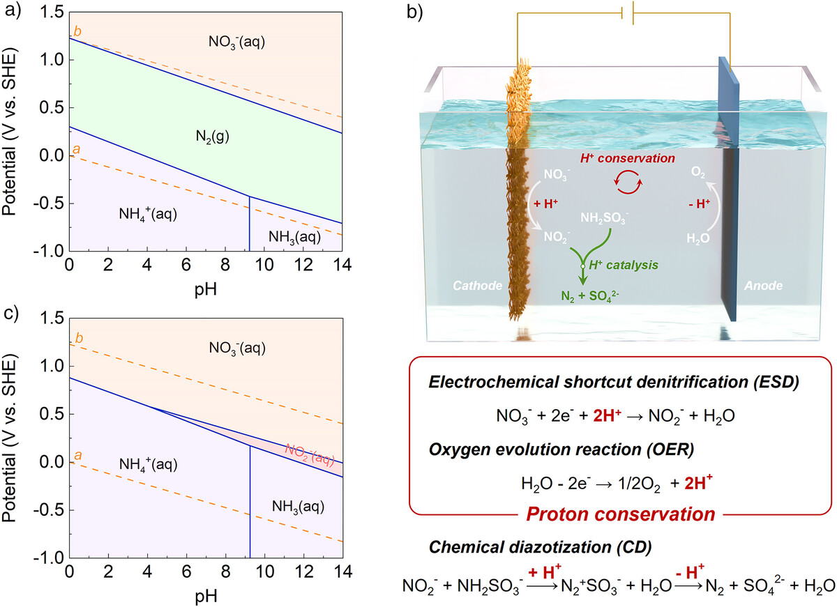 图1. ESD-CD的NO₃⁻去除原理。a) NO₃⁻–N₂–NH₄⁺/NH₃体系在T = 298 K下的理论Pourbaix图。标记为“a”的虚线对应析氢反应(HER)的平衡电位,而标记为“b”的虚线代表析氧反应(OER)的平衡电位。b) 本研究中提出的ESD-CD示意图。c) NO₃⁻–NO₂⁻–NH₄⁺/NH₃体系在T = 298 K下的理论Pourbaix图。