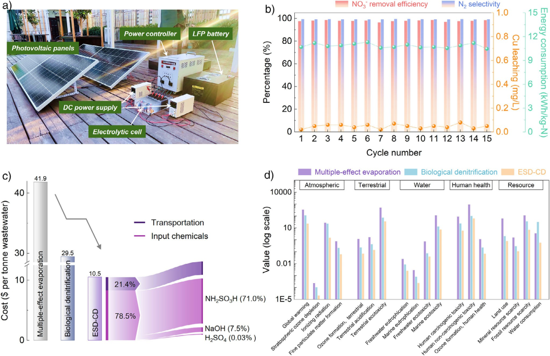 图6. 太阳能驱动的工业硝酸盐废水处理。a) 光伏驱动ESD-CD系统处理4.5 L废水的照片及b) 连续15次运行期间相应的反硝化性能(电流密度:10 mA·cm⁻²,NO₃⁻浓度:3085.2 mg-N·L⁻¹)。c) 多效蒸发、生物脱氮及光伏驱动ESD-CD的废水处理成本比较。d) 多效蒸发、生物脱氮及光伏驱动ESD-CD在18类环境影响指标上的比较。