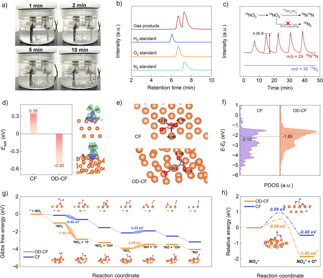 图5. 脱氮机制。a) 电解槽中N₂气泡形成的照片(NO₃⁻浓度:5000 mg-N·L⁻¹)。b) 气体产物及标准气体的GC信号。c) 通过ESD-CD去除NO₃⁻的在线DEMS测量。d) CF和OD-CF上NO₃⁻吸附能的计算及电荷密度差结果。紫色等值面代表电荷耗竭区,绿色等值面对应电荷积累区。e) Bader电荷分析和f) CF与OD-CF的PDOS图。g) CF和OD-CF上NO₃⁻–NO₂⁻–NO反应路径的自由能图。h) CF和OD-CF上*NO₃中N─O键解离过渡态的计算。