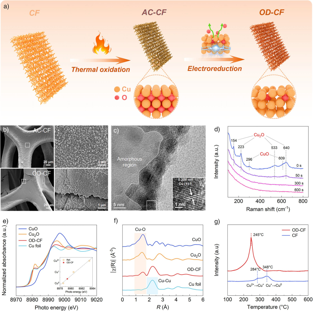 图2. 合成与表征。a) OD-CF的热氧化-电还原合成示意图。b) AC-CF和OD-CF的SEM图像。c) OD-CF的HRTEM图像。d) AC-CF电还原过程中原位电化学拉曼光谱的时间依赖性变化。e) OD-CF及参考物的归一化Cu K-edge XANES谱和f) 傅里叶变换k²加权谱。g) OD-CF和CF的H₂-TPR谱。