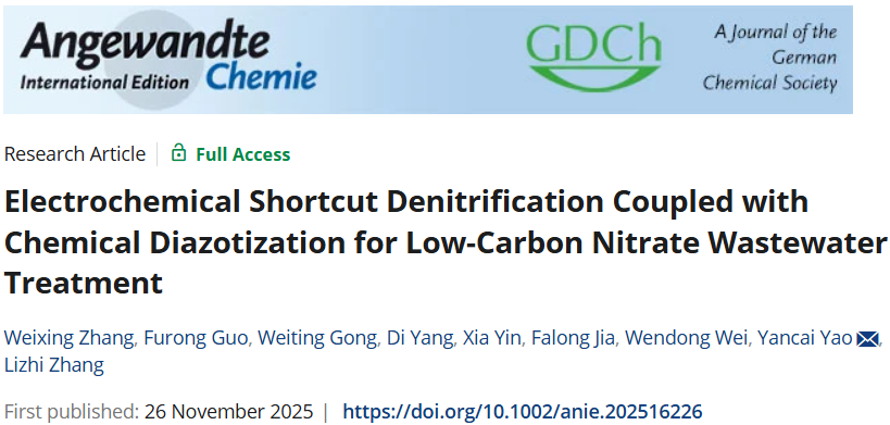 2025年11月26日,上海交通大学张礼知(国家杰青/长江学者)、么艳彩团队在Angewandte Chemie International Edition期刊发表题为“Electrochemical Shortcut Denitrification Coupled with Chemical Diazotization for Low-Carbon Nitrate Wastewater Treatment”的研究论文,华中师范大学张伟星、上海交通大学郭福荣为论文共同第一作者,么艳彩为论文通讯作者。