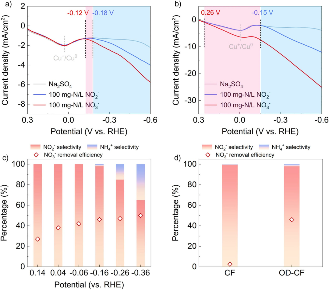图3. 电化学短程脱氮。a) CF和b) OD-CF的LSV曲线。c) OD-CF在不同电位下的ENRR活性(NO₃⁻浓度:100 mg-N·L⁻¹)。d) CF和OD-CF在–0.16 V vs. RHE电位下ENRR活性的比较。